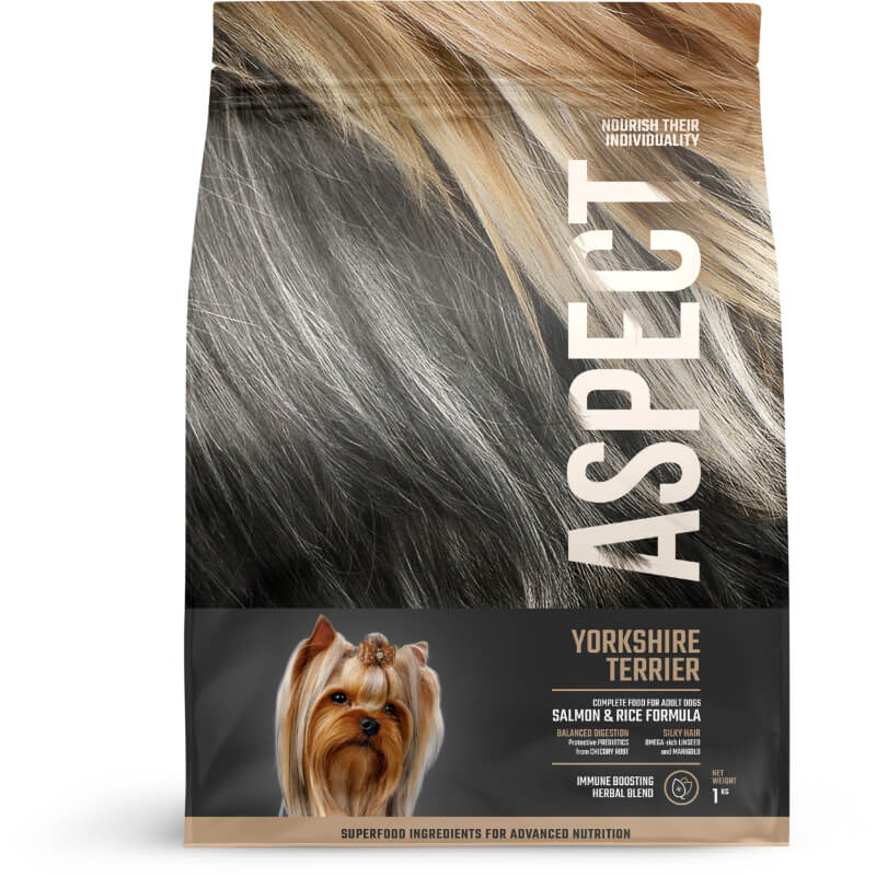 Yorkshirski terier ali Yorkie je najbolj glamurozen med vsemi terierji. Ponaša se s čudovito svileno dlako; kljub ljubkemu izgledu, pa se v njem vseeno skriva individualna in samosvoja terierska duša. Hrana Aspect za yorkshirske terierje vsebuje
