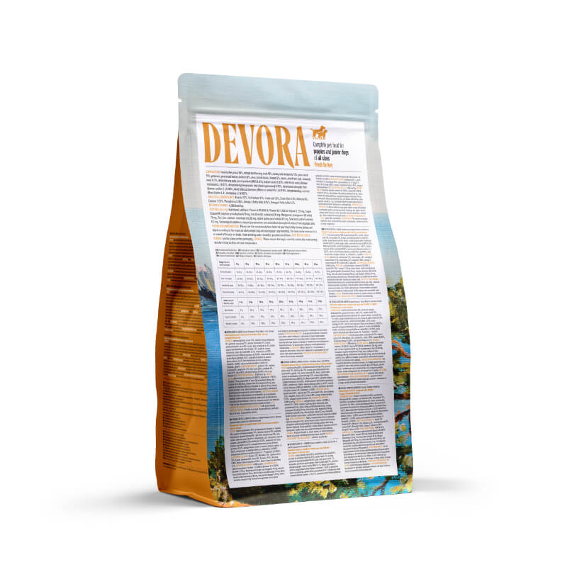 Nahranite svojega družinskega člana s kakovostno briketirano hrano Devora. Linija hrane Starter to Junior je primerna za hranjenje pasjih mladičkov od 1. do 12. meseca starosti manjše rasti. Pakirana je v embalaži s patentnim zapiranjem, ki ob primernem skladiščenju pomaga pri ohranjanju svežine vsebine.