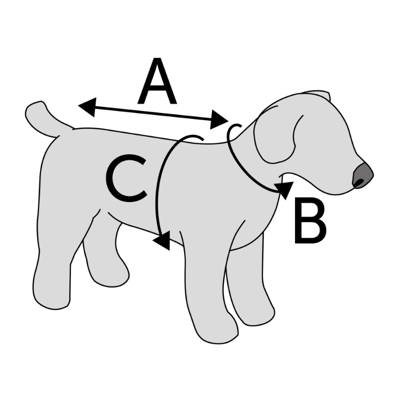 Dolžina hrbta (A) | Obseg vratu (B) | Obseg prsnega koša (C) |
