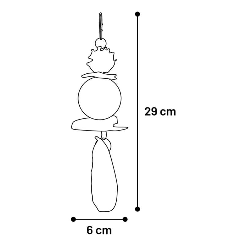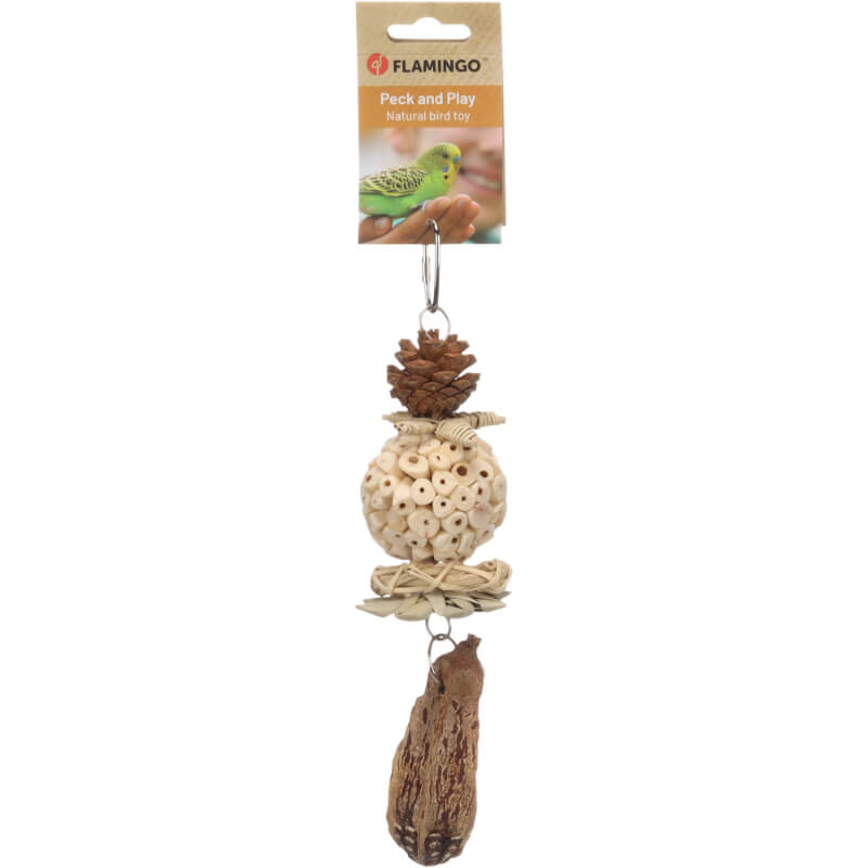 Zanimiva viseča igračka je izdelana iz naravnih materialov, kot so les, mahagonijev strok, ratan, storž in palmovi listi. Igrača bo vašega ptička spodbudila k fizični aktivnosti, saj omogoča, da jo ptica raziskuje in premika s svojim kljunčkom. Na strop kletke jo enostavno obesite s kovinskim karabinom.