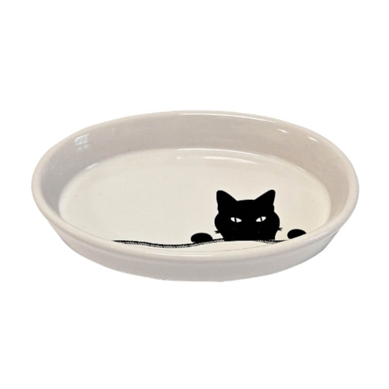 Posodica s sijočo glazuro je enostavna za čiščenje in primerna za pranje v pomivalnem stroju. Izdelek je ovalne oblike in ima nizke robove, kar pomeni da se med hranjenjem občutljive mačje brčice ne dotikajo stene posode.