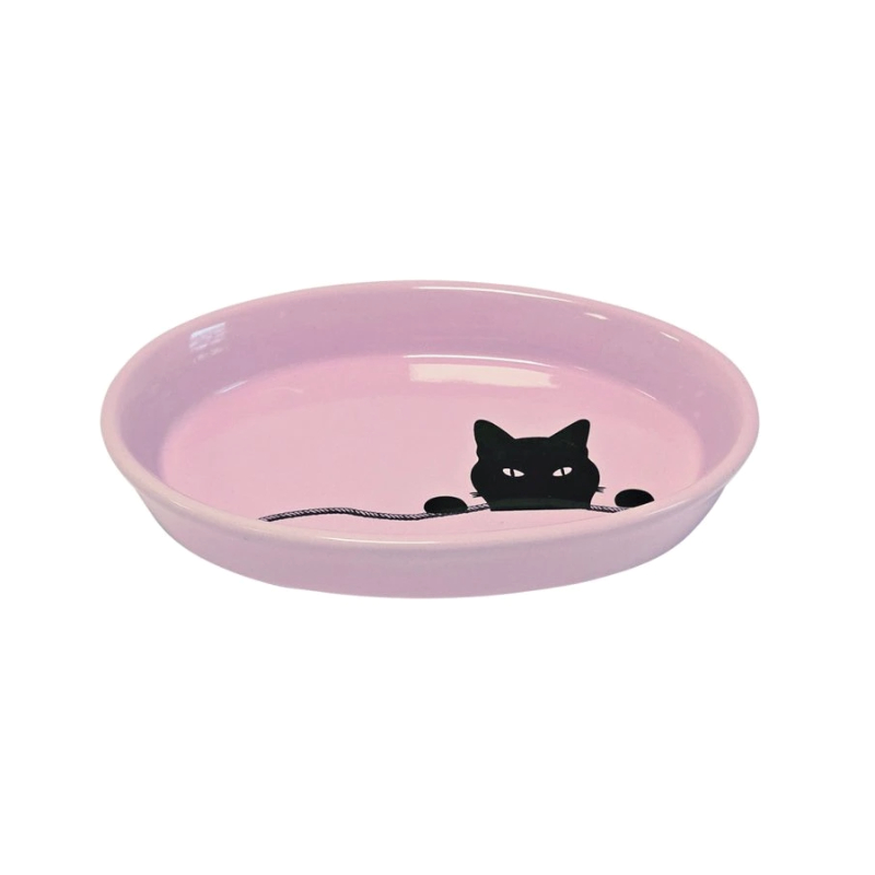 Posodica s sijočo glazuro je enostavna za čiščenje in primerna za pranje v pomivalnem stroju. Izdelek je ovalne oblike in ima nizke robove, kar pomeni da se med hranjenjem občutljive mačje brčice ne dotikajo stene posode.