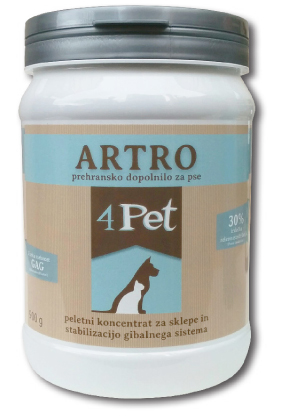Hladno stiskani peleti Artro 4Pet so naravno in učinkovito prehransko dopolnilo za pse, ki imajo težave s sklepi, vezmi in celotnim gibalnim sistemom. Artro 4Pet vsebuje 30% koncentrata zelenoustnih školjk, ki je eden izmed najboljših virov naravnih glikozaminoglikanov (GAG). Poleg glukozamina vsebuje še kombinacijo nenasičenih maščobnih kislin, vitamina C in izvlečka iz grozdnih pešk. Omega-3 in Omega-6 maščobne kisline zmanjšujejo vnetja v sklepih in blažijo bolečino, vitamin C in izvleček OPC pa sta odlična antioksidanta za boj proti prostim radikalom in zaščito sklepov ter hrustanca.