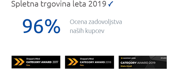 Naša spletna trgovina je na največjem tekmovanju s področja spletnega nakupovanja v Sloveniji že tretje leto zapored prejela nagrado za spletnega trgovca leta 2019 v kategoriji Pets. Na letošnje tekmovanje se je prijavilo rekordnih 266 trgovin, zmagovalce so določili kupci v kombinaciji z mednarodno 30-člansko strokovno žirijo. V letošnji raziskavi zadovoljstva ste nam kupci namenili kar 96% oceno zadovoljstva! Za izkazano zaupanje se vam iskreno zahvaljujemo in se zavezujemo k odličnosti tudi v prihodnje!