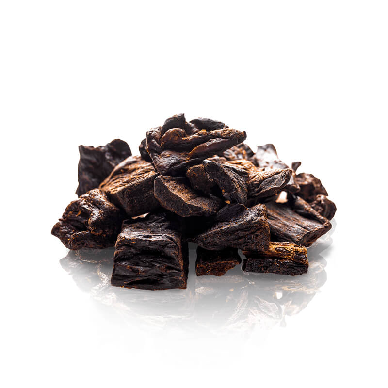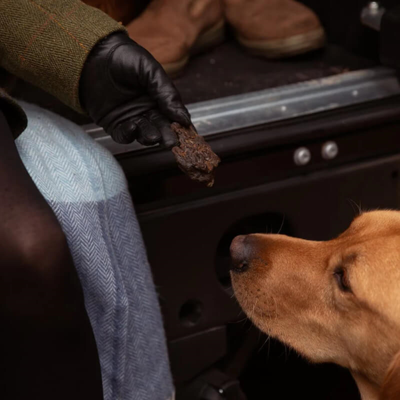 Dopolnilna hrana za pse v obliki kvadratkov vsebuje posušena goveja jetra. Govedina ima visoko beljakovinsko vrednost ter je bogata z vitamini in minerali, predvsem vitamini B kompleksa, cinkom in železom. Posladki so brez žit in pripravljeni po BOF ("Behavioral Optimizing Foods") merilih - po zaužitju ne prihaja do velikih nihanj v krvnem sladkorju. Za učinkovito zagotavljanje ohranjanja svežine je embalaža opremljena s patentnim zapiralom, ki omogoča dobro ponovno zapiranje odprtega izdelka.