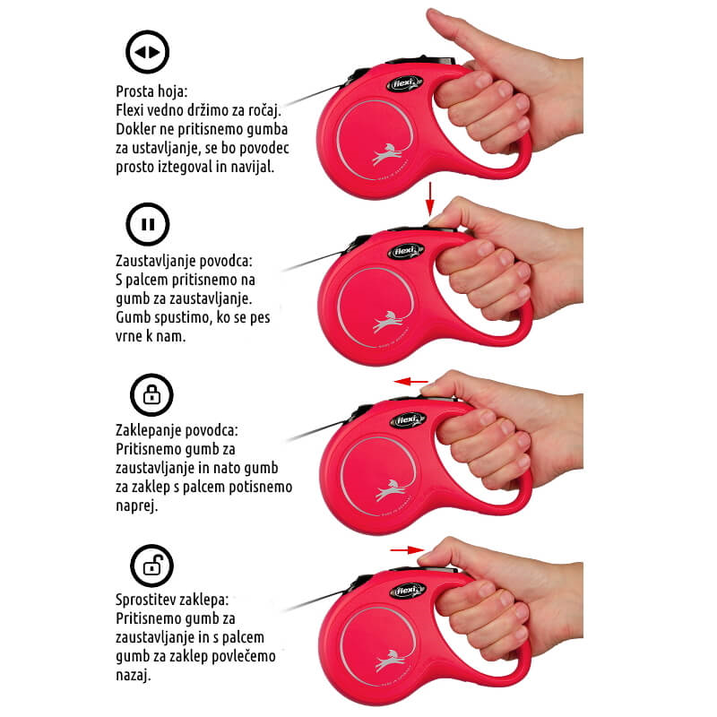Zelo dolga in zložljiva vrvica bo poskrbela, da se bo vaš pes lahko gibal svobodno v premeru 8 m, s čimer bo pridobil na še večji fizični aktivnosti. Če želite psa privabiti nazaj pa preprosto s pritiskom palca pritisnete na zavoro, ki bo ustavila zavijanje, in z nežnim potegom psu daste vedeti, da da ga želite priklicati bližje.