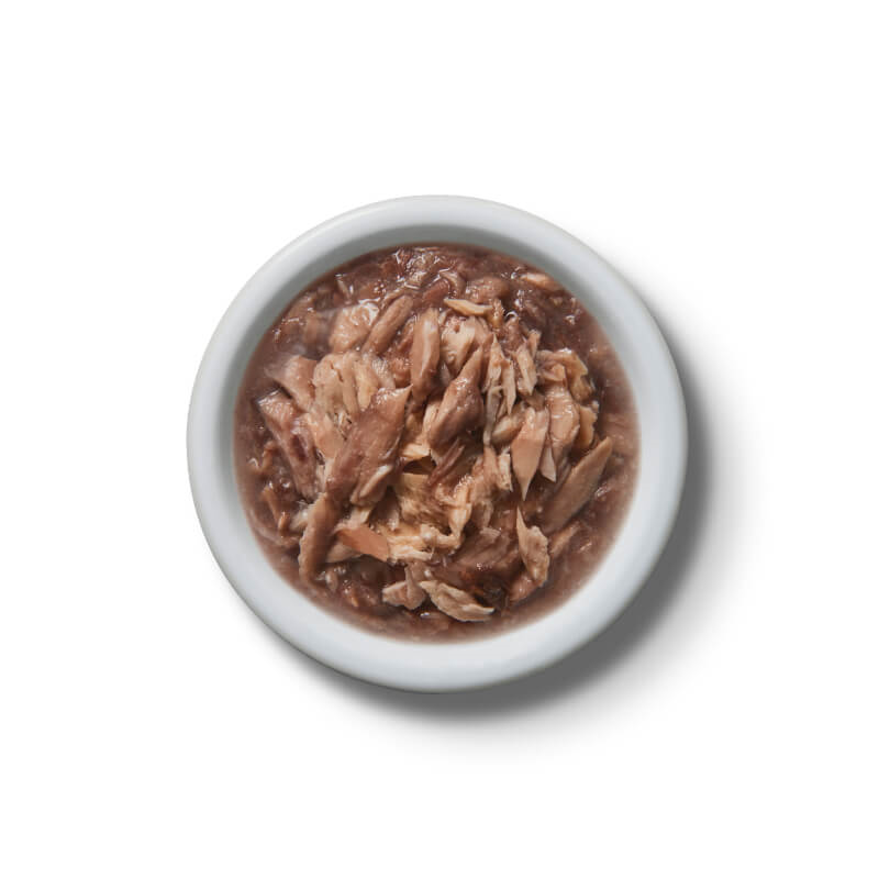 SESTAVA: sveže pripravljen piščanec 45%, sveže pripravljene školjke 3%, piščančja mesna juha 47%, sončnično olje, minerali, tapioka, olje tune.