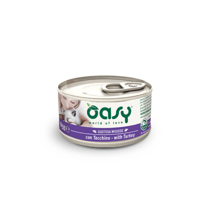 Popolna mokra hrana Oasy Tasty Mousse predstavlja samostojen obrok odraslih mačk in vsebuje vse kar vaš mucek potrebuje. Vsebuje puranje meso in je brez dodanih umetnih barvil, arom ali konzervansov ter brez žit, gensko spremenjenih organizmov (GSO) in soje. V hrani so samo skrbno izbrane kakovostne sestavine.