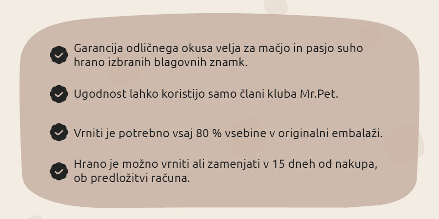 Velja samo za člane kluba (nakup mora biti opravljen na člana kluba Mr.Pet), največ tri menjave oz. vračila letno. Nakupu in vračilu mora biti priložena ista številka kartice kluba Mr.Pet. Velja tudi za spletne nakupe (neposredne stroške vračila blaga nosi potrošnik). Splošni pogoji ugodnosti se lahko spremenijo in bodo objavljeni na www.mrpet.si/t-garancija-okusa.aspx.