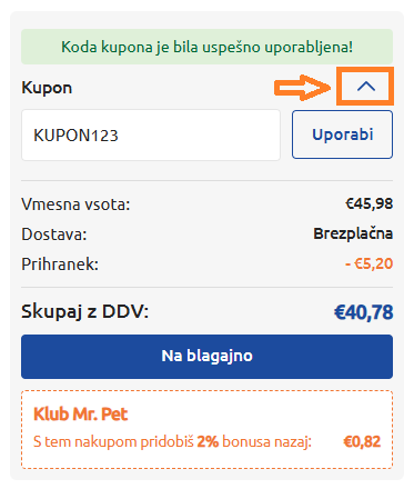 1. V košarici pri razdelku »Kupon« kliknite na puščico navzdol. Odprlo se bo polje, kamor lahko vnesete kodo kupona.