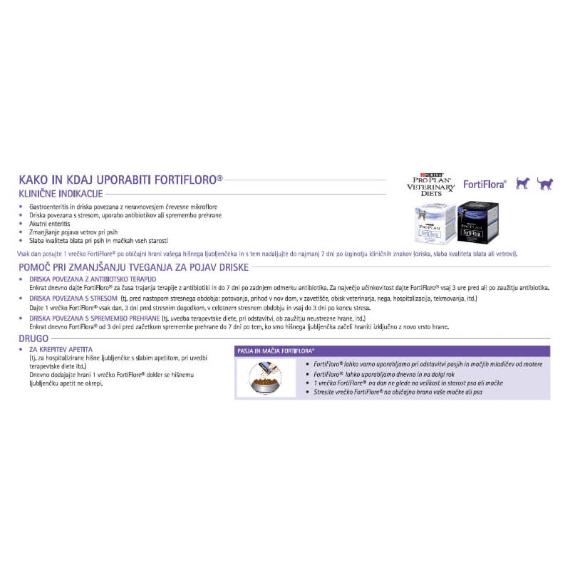 Probiotiki ProPlan Fortiflora dokazano pripomorejo k zdravemu imunskemu sistemu ter zdravju črevesne mikroflore. Vsaka vrečica vsebuje zagotovljeno vsebnost probiotikov, mikroenkapsuliranih za stabilnost in učinkovitost. Vsebino vrečke preprosto vsujemo v hrano našega ljubljenca!